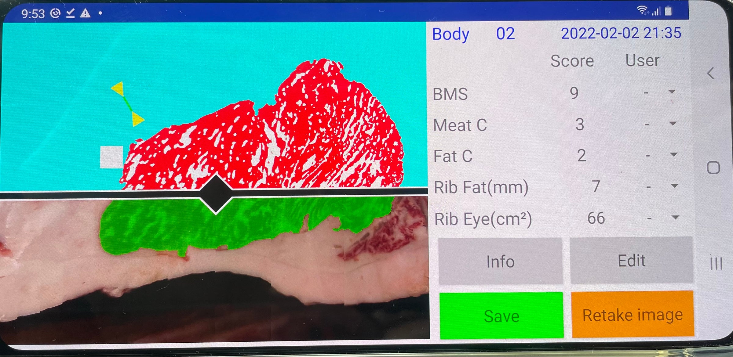 We knew early on that we wanted to focus on meat production with our Wagyu. Our goal stated simply is to produce the highest grades of Wagyu, consistently. To document that journey, we made the investment early on in a cellphone based carcass camera system. Thanks to the advances in cell phone cameras, their onboard processing power and the ability to harness cloud based computing we are able to image and receive complete assessment reports in moments. When we quote a carcass as being a certain BMS score it is based on this technology and audited by our family with old fashioned flash cards.